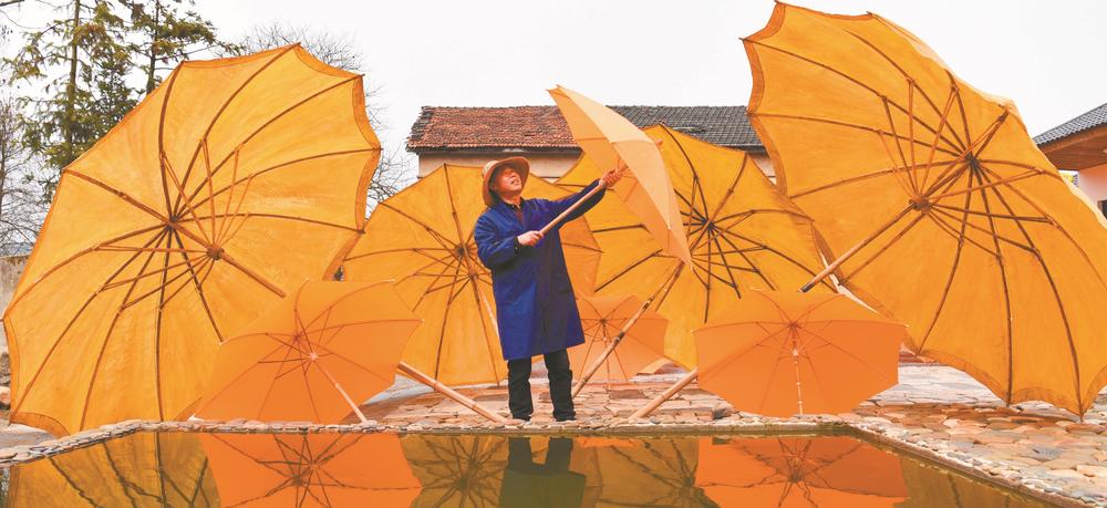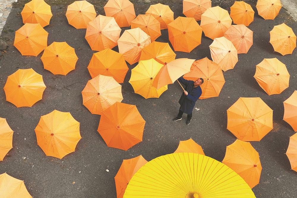 It's the season of drizzling spring rain again. Zheng Guomin, the inheritor of the provincial intangible cultural heritage of Jingxian County oilcloth umbrella making, has been busy making oilcloth umbrellas all winter. Now it's time to put them on the market. Taking advantage of the sunny weather, he hung the umbrellas out to dry just like orange flowers blossoming in the courtyard, which is very beautiful.