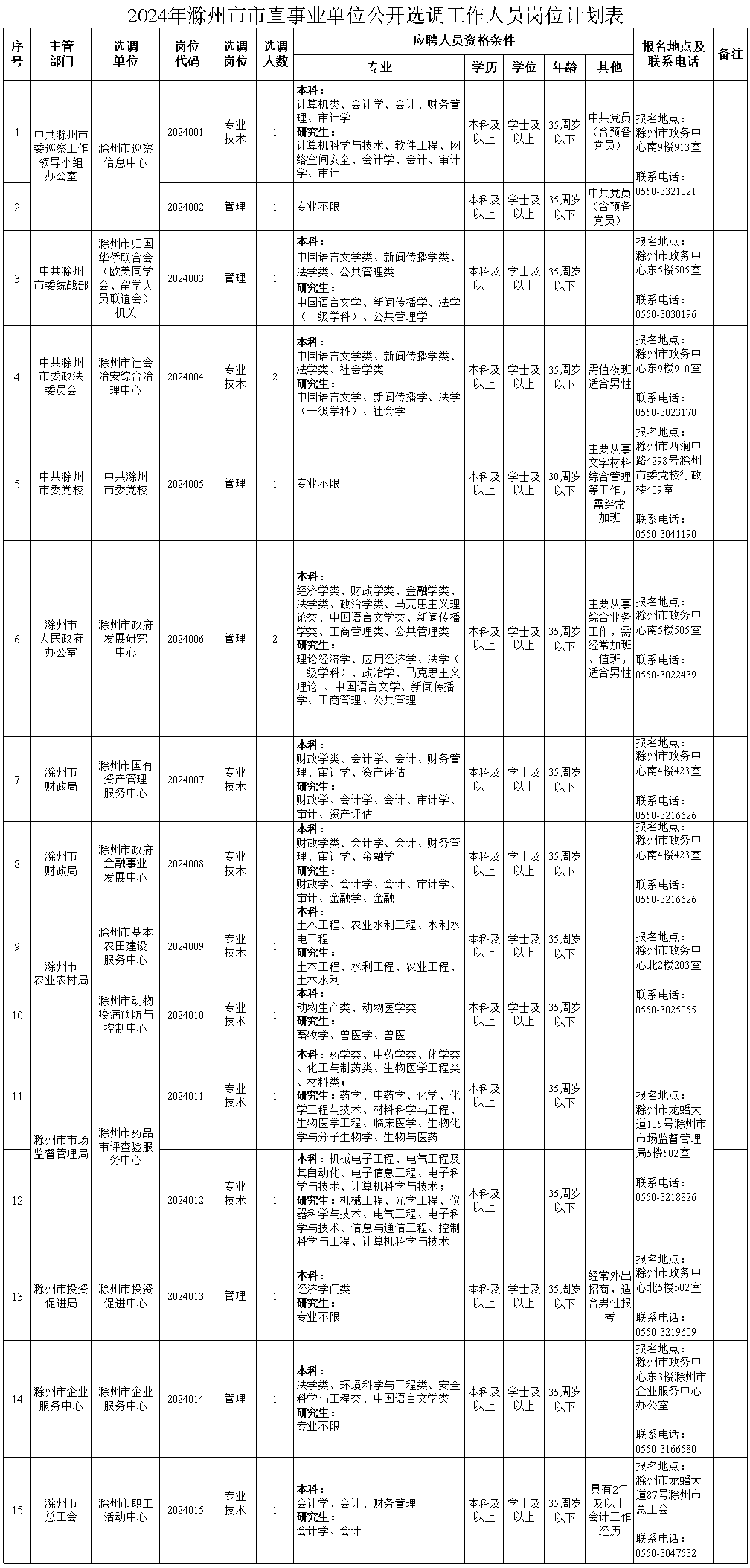本次计划选调工作人员17名,详见《2024年滁州市市直事业单位公开选调工作人员岗位计划表》(以下简称《岗位计划表》)。其中拟选调管理岗位为九级及以下、专业技术岗位为初级。