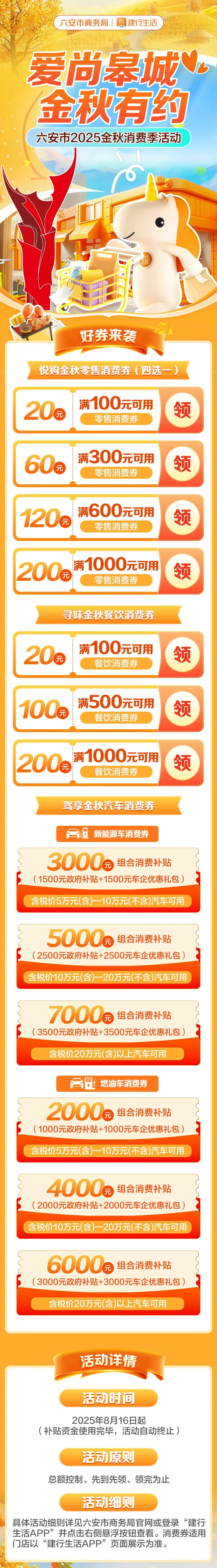 六安市商务局统筹、市县联动开展“爱尚皋城 金秋有约”六安市2025金秋消费季活动,并于8月16日在主城区正式启动零售百货、餐饮、汽车消费券发放活动。