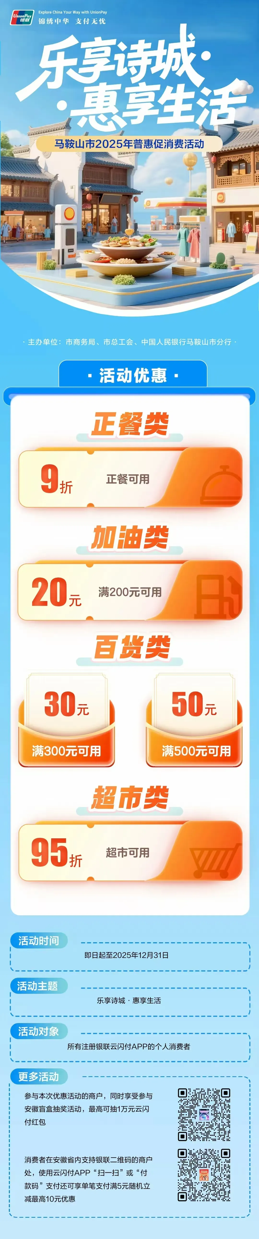 2025年“乐享诗城·惠享生活”普惠促消费活动将吸引马鞍山餐饮、商超、百货、家电、加油等领域重点商户参与,动员商家推出让利优惠政策,通过银联云闪付APP进行发放。整个活动将持续到今年年底,预计消费券总额不少于1500万元,将分若干批进行发放。