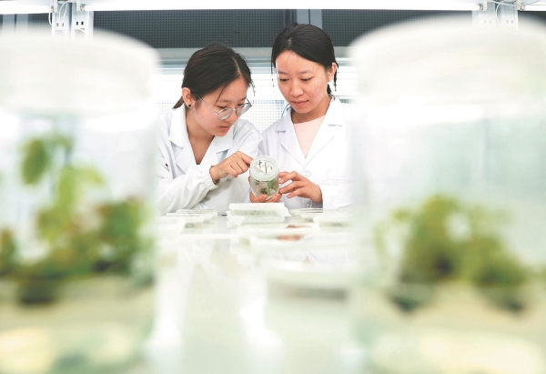 7月6日,在南京农业大学大豆生物育种中心(宿州)二楼人工气候室,研究生正讨论大豆组织培养生长情况。记者 王兰兰 王珂 摄