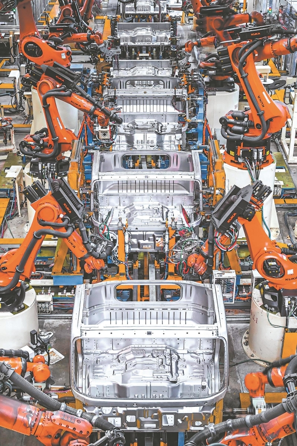 江汽集团高端与纯电动轻卡基地生产线,智能机械臂灵活挥舞,一辆辆汽车从这里走下生产线。(资料图片)记者 范柏文 摄