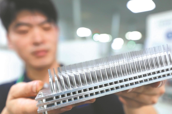 8月10日,淮北烈山经济开发区一家电子制造企业生产车间内,工人展示生产的微型钻头。通讯员 李鑫 杜磊 摄