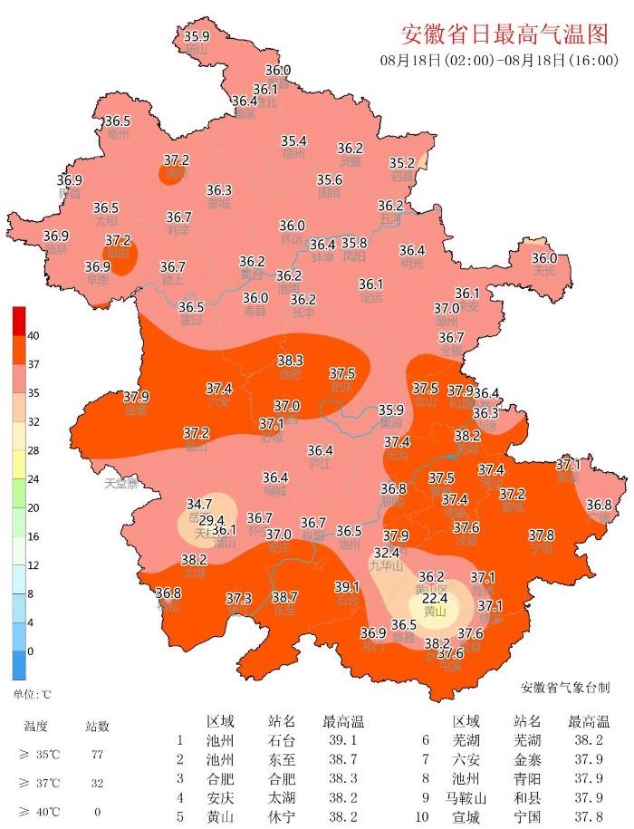 在8月18日安徽省日最高气温图上,还是红彤彤一片。从数据来看,截至18日16时,安徽省78个非高山站点中,有77个站点出现了35℃以上高温。记者查询发现,唯一一个最高气温在高温线之下的站点是岳西,最高气温为34.7℃。全省有32个站点最高气温超过了37℃,超过37℃站点数量较前一天少了一个。18日全省气温最高出现在石台,为39.1℃,这个数值和前一天持平。