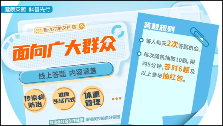 参赛者可在“安徽省疾控局”微信公众号线上参与,每天可通过线上平台两次答题,每次随机10题,答对6题及以上即可参与抽奖赢取红包。形式轻便活泼,让“知法、守法、防病、强身”成为社会共识。