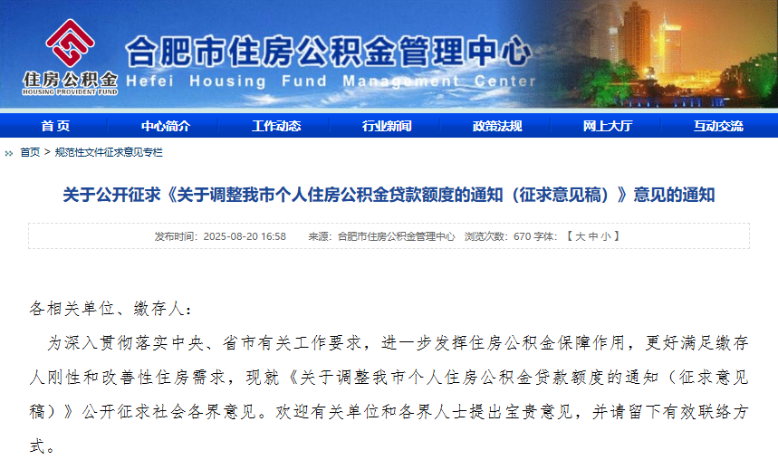 为更好满足缴存人刚性和改善性住房需求,8月20日起,合肥市住房公积金管理委员会办公室对《关于调整我市个人住房公积金贷款额度的通知(征求意见稿)》(以下简称《征求意见稿》)公开征求社会各界意见。