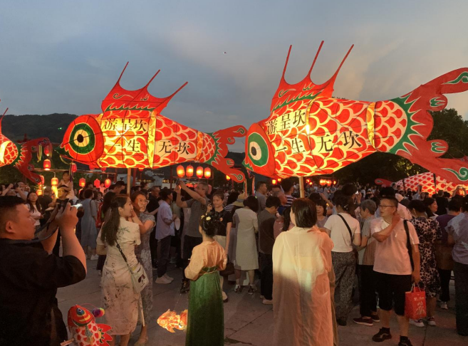 暮色四合时,永兴湖畔的鱼灯次第亮起。红鳞金尾的锦鲤灯在汉服少女掌中摇曳,绿鳍朱鳞的龙鱼灯随鼓点腾跃,游客手持微型鱼灯穿梭于荷田栈道,灯影与荷影在暮色中交织成一幅流动的《鱼跃莲生图》。这场被网友称为“徽州版《长安十二时辰》”的鱼灯巡游,正是呈坎暑期文旅创新的缩影。