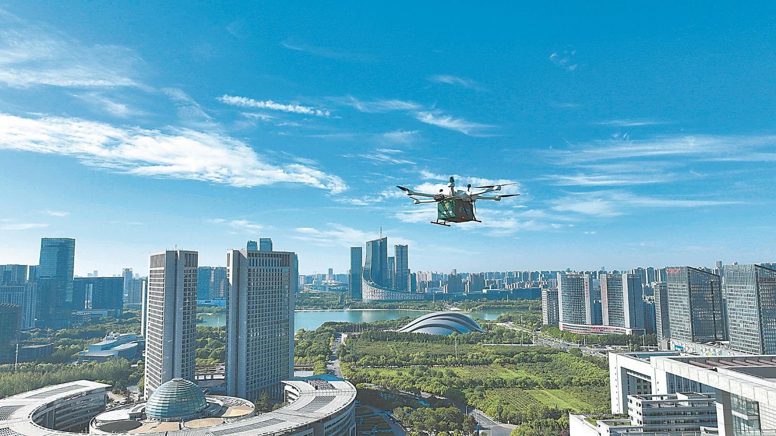 8月20日,合肥市蜀山区,无人机在配送快递包裹(无人机照片)。近年来,中国邮政集团有限公司安徽省分公司积极引入新兴科技手段,无人机、无人车、智能分拣机器人……推动邮政快递业务数智化转型,不断提高服务效率和响应速度。新华社记者 黄博涵 摄