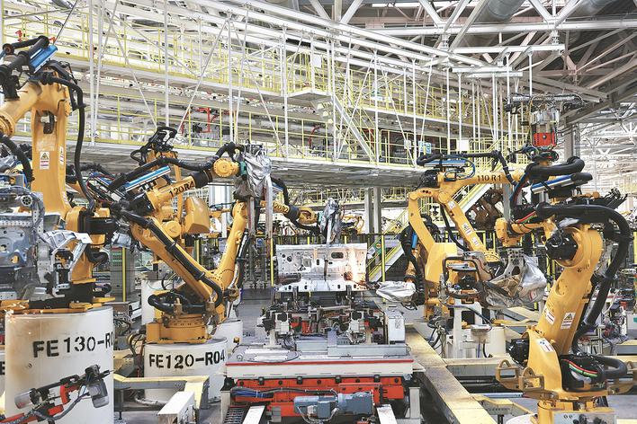 一走进工厂内部,沿着参观路径便能发现冲压、焊装、涂装、总装四大车间仿若“钢铁森林”,各种各样的摇臂机器人正在不知疲倦地忙碌着。