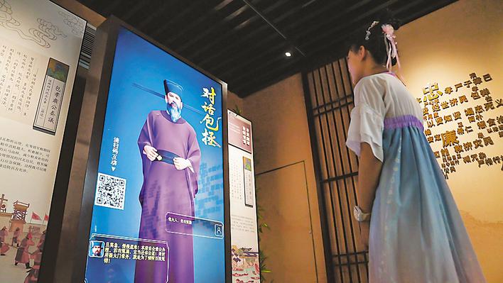 馆内,泛黄的奏议史料与裸眼3D、AR、VR、CAVE剧场等科技手段碰撞:北宋朝堂的烛火在墙面跳动,包拯体恤民情的奏疏化作流民返乡的图景,澄清吏治的主张随动画演绎成官场清风……