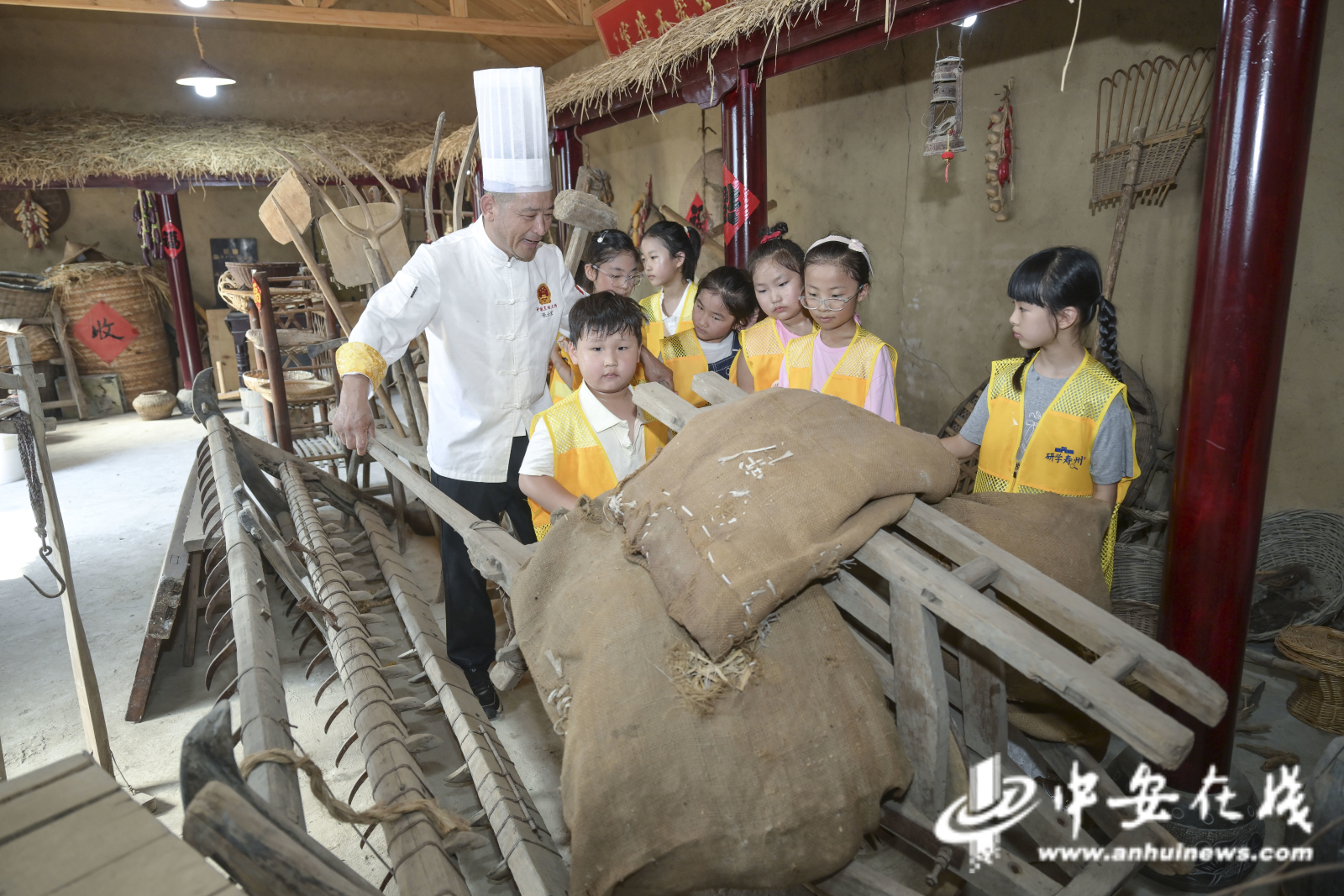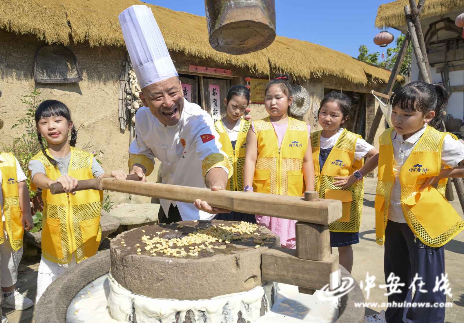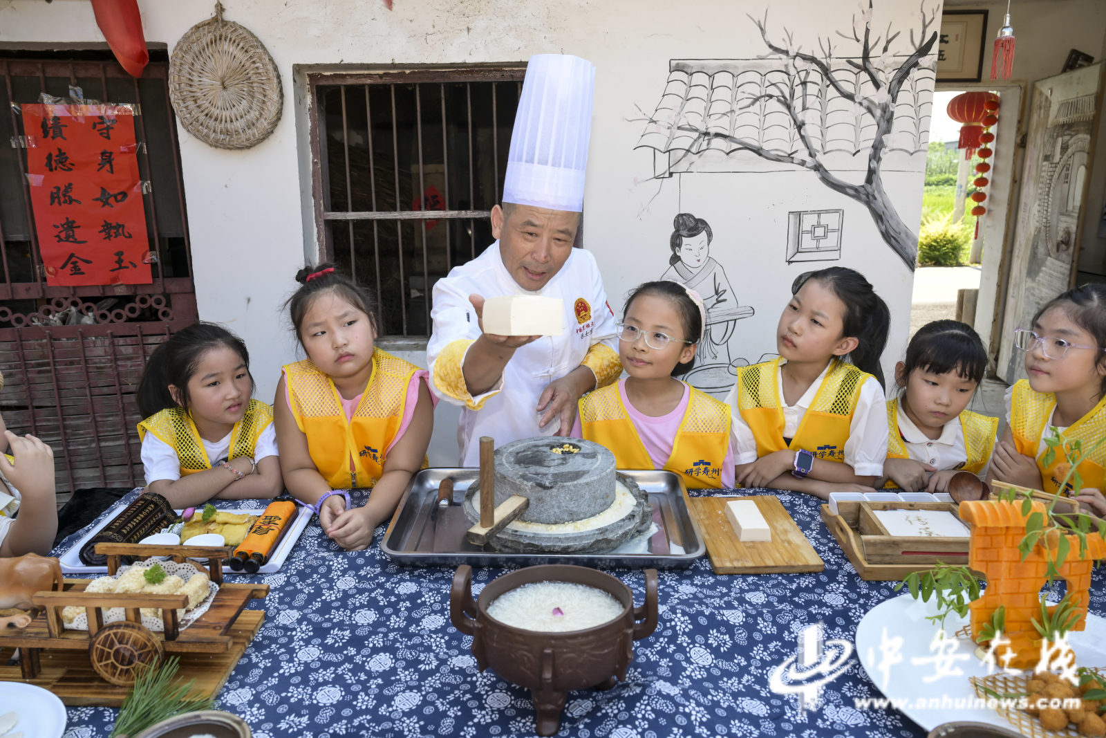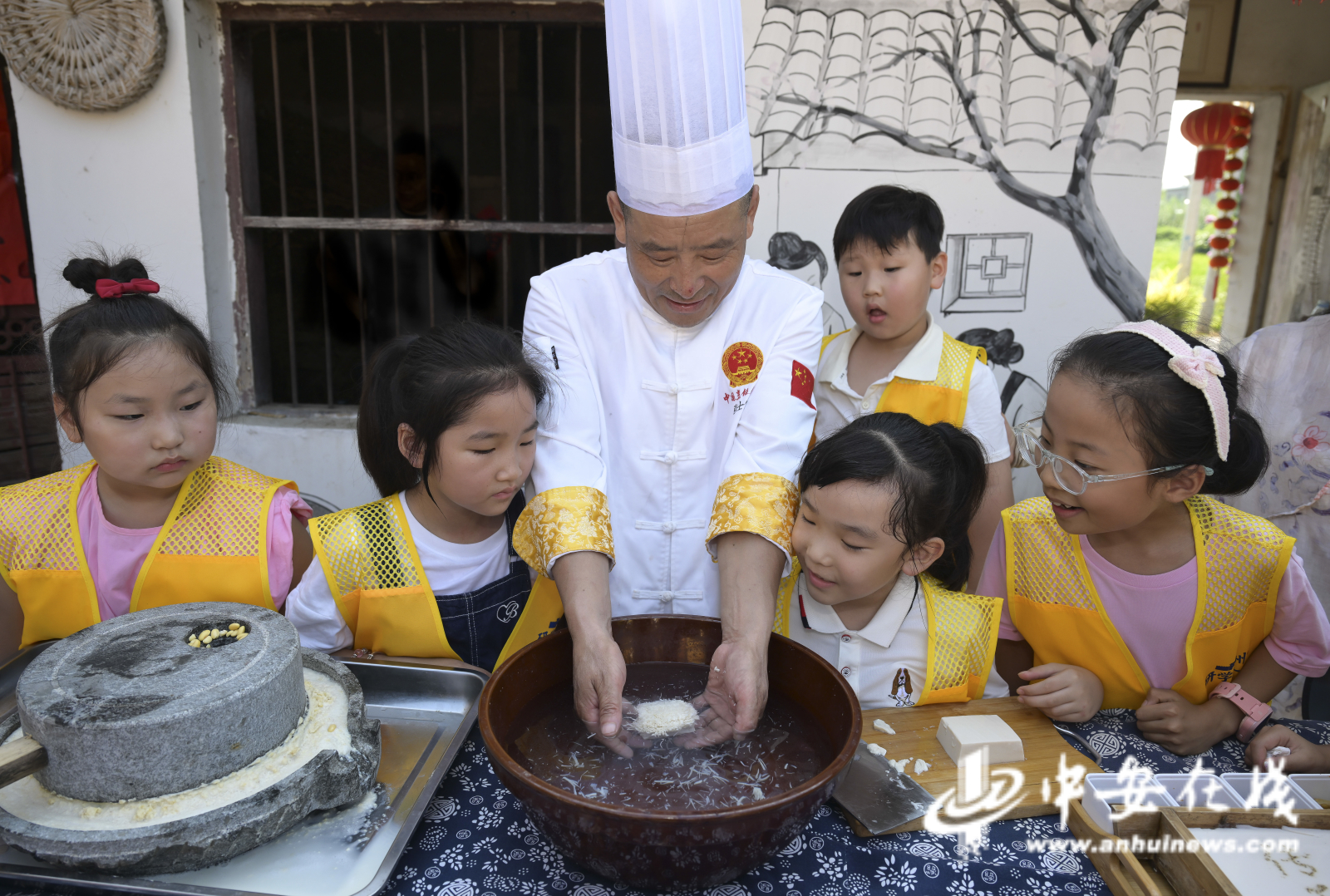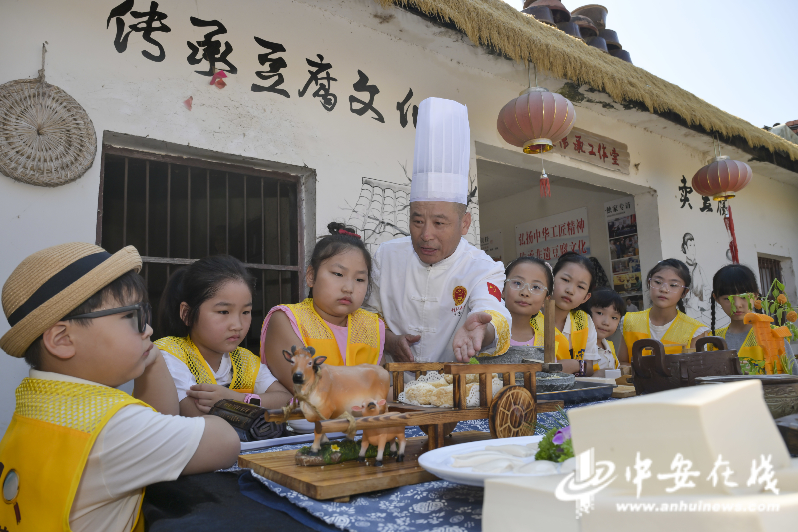 中安在线、中安新闻客户端讯 暑假期间,一场别开生面的“非遗+研学”活动在安徽淮南寿县双桥镇大郢村展开。孩子们围在省级非遗“玛瑙泉豆腐宴”传承人张士宏身旁,目不转睛地看他手持菜刀,在柔软的豆腐上运刀如飞。短短一分钟,一块方寸之间的豆腐便在手中绽放成千丝万缕的菊花形态,引得孩子们连连惊叹。
