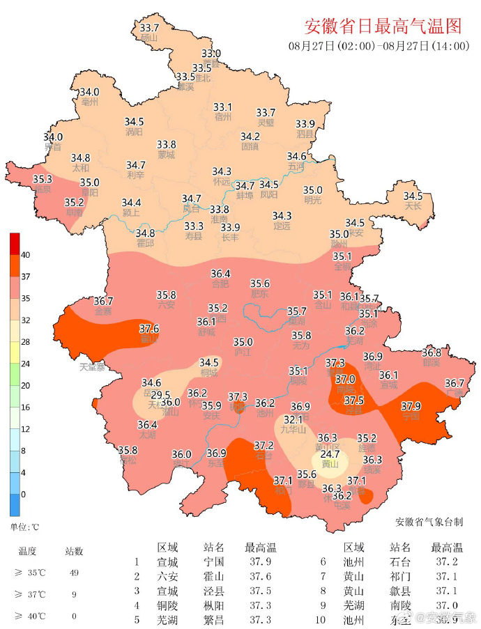 据安徽省气象台预报,28日至29日全省有高温天气,部分地区37~39℃,局部可达40℃。