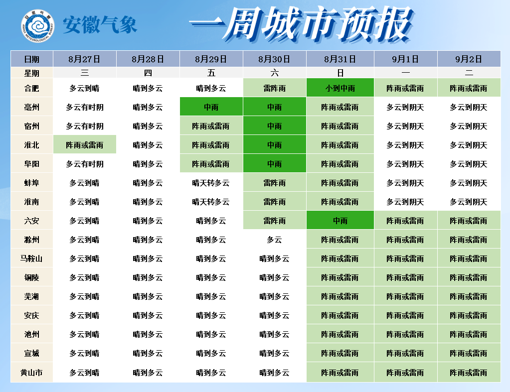 30日(周六):江北多云到阴天,其中沿淮淮北有雷阵雨,部分地区中雨,江淮之间部分地区有雷阵雨;其他地区晴到多云,皖南山区局部地区午后有短时雷阵雨。