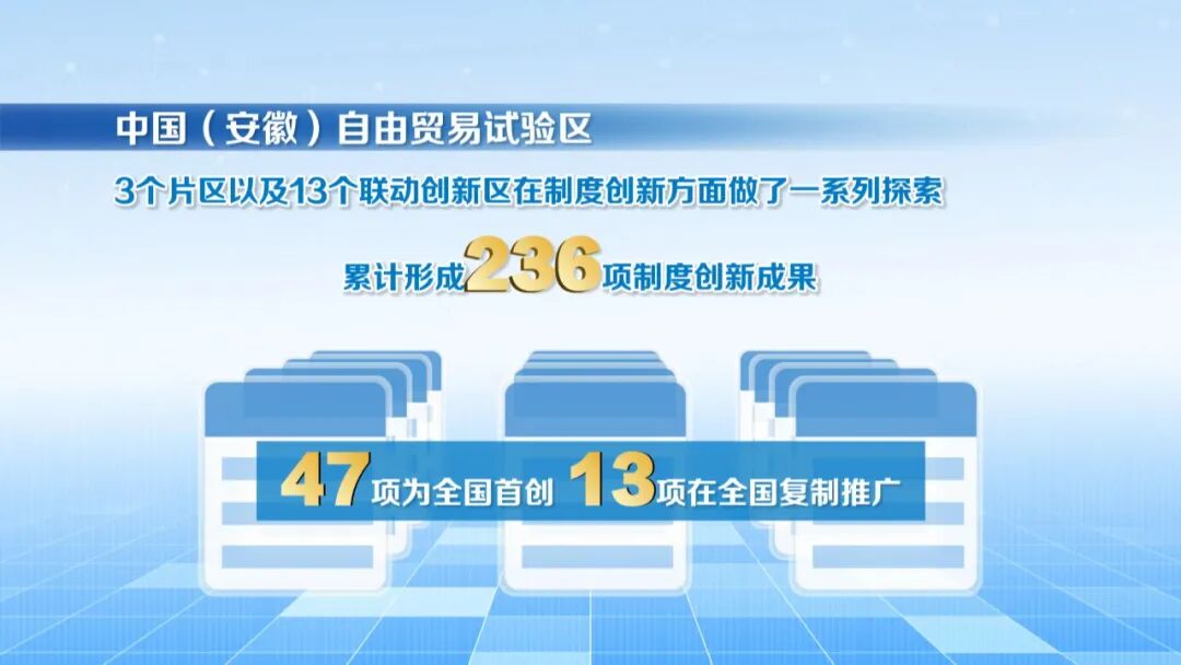 本着“大胆试、大胆闯、自主改”的原则,安徽自贸试验区3个片区以及13个联动创新区在制度创新方面做了一系列探索,累计形成236项制度创新成果,其中有47项为全国首创,13项在全国复制推广,以不到全省千分之一的面积,贡献了全省约25%进出口,三分之一的外商投资。