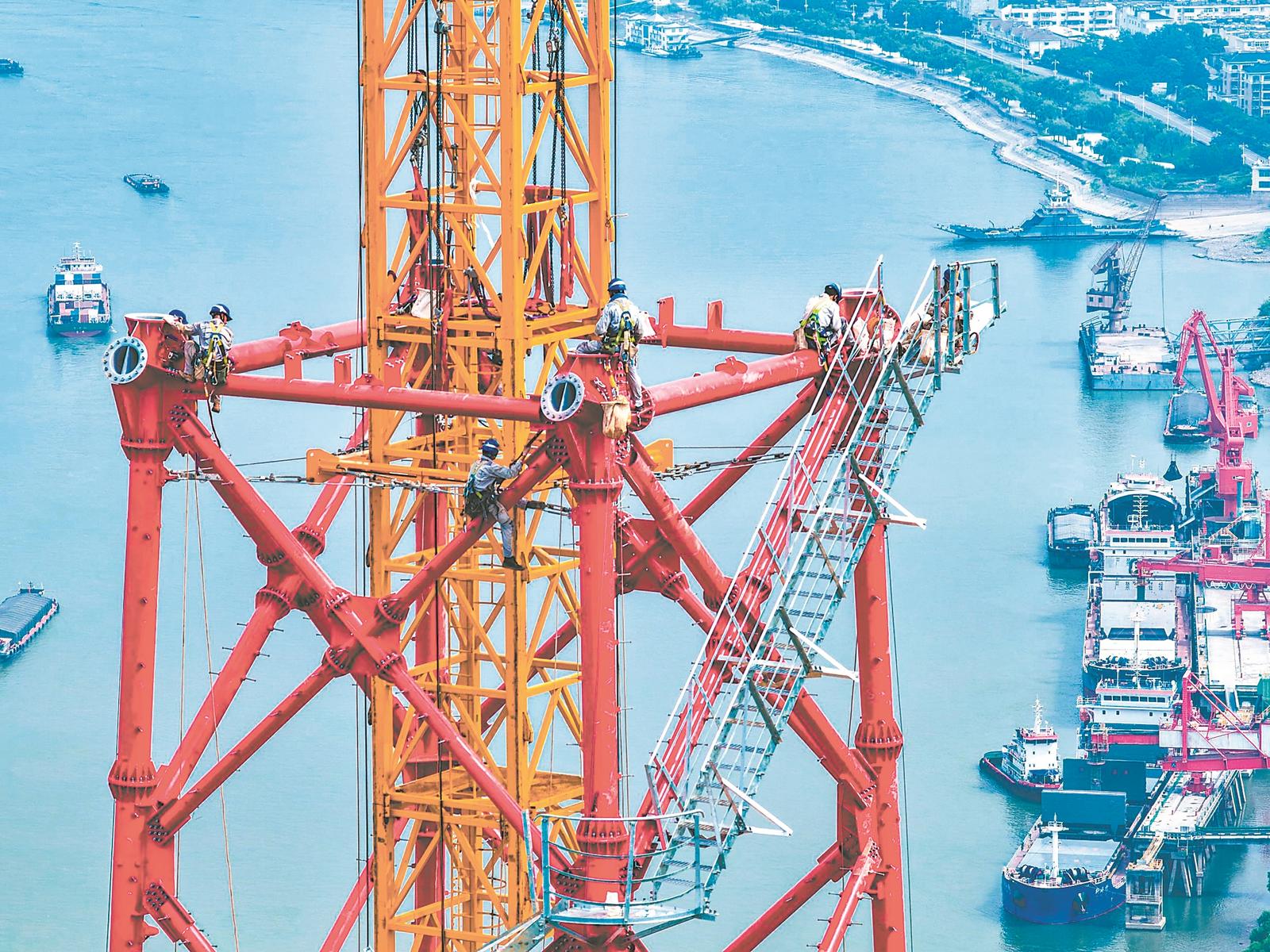 9月1日,在芜湖市繁昌区荻港镇长江岸边,安徽送变电工程有限公司施工人员在进行肥西—繁昌500千伏过渡工程长江大跨越输电塔安装作业。该工程是甘肃至浙江±800千伏特高压直流输电工程关键项目之一,工程起于甘肃武威,止于浙江绍兴,途经甘肃、宁夏、陕西、河南、安徽、浙江6省区,线路全长2370公里,建成后将有效促进西部地区清洁能源外送,为长三角地区经济社会高质量发展提供强有力的电力保障。通讯员 鲁君元 摄
