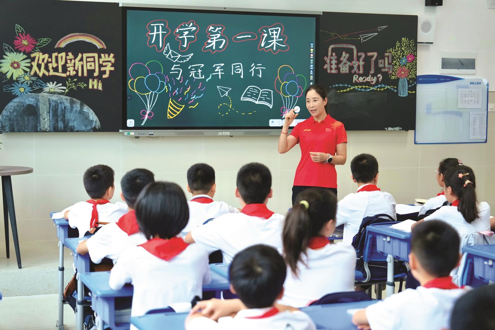 9月1日上午,合肥市五十中学天鹅湖教育集团天鹅湖校区(奥体分部)“承冠军志 燃体育情 赴青春约”开学典礼举办,2000年悉尼奥运会女子20公里竞走冠军、北京体育大学田径学院竞走国家级教练王丽萍受聘担任合肥市五十中天鹅湖教育集团体育校长,并走进班级给同学们带来了“开学第一课”。
