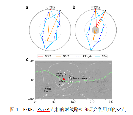 为突破这一挑战,研究团队创新性地引入火震阵列分析方法,通过对23个信噪比较高的火震事件数据的分析,成功提取出穿过火星核的关键震相,如在地表反射的PKPPKP(P'P')和在核幔边界反射的PKKP(图1a)。特别值得注意的是,实际观测到的PKKP到时,较当前仅考虑液态核的火星速度模型所预测的结果提前了50至200秒。地震波在固体中的传播速度比在液体中快。因此,这一差异表明,火星核具有分层结构:即外层为液态核,而更深部则存在一个波速更高的固态内核。