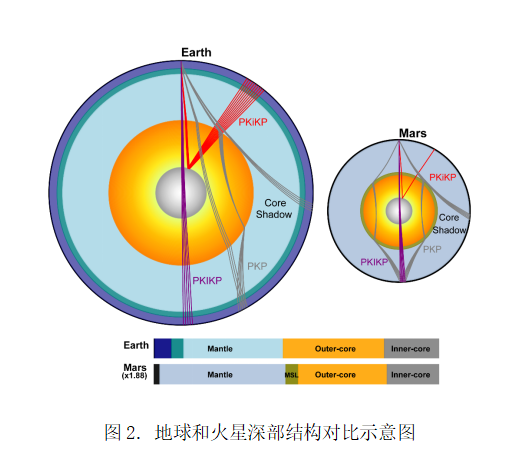 在进一步分析中,研究团队首次在火震数据中识别出被视为“固态内核标志”的 PKiKP 震相信号(图 1b)。这一发现为火星存在固态内核提供了证据。结合不同火核震相,团队测得火星固态内核半径约 600 公里,占火星半径的 1/5(图 2)。如将火星按比例放大至地球大小,其内外核结构比例与地球高度接近(图 2)。