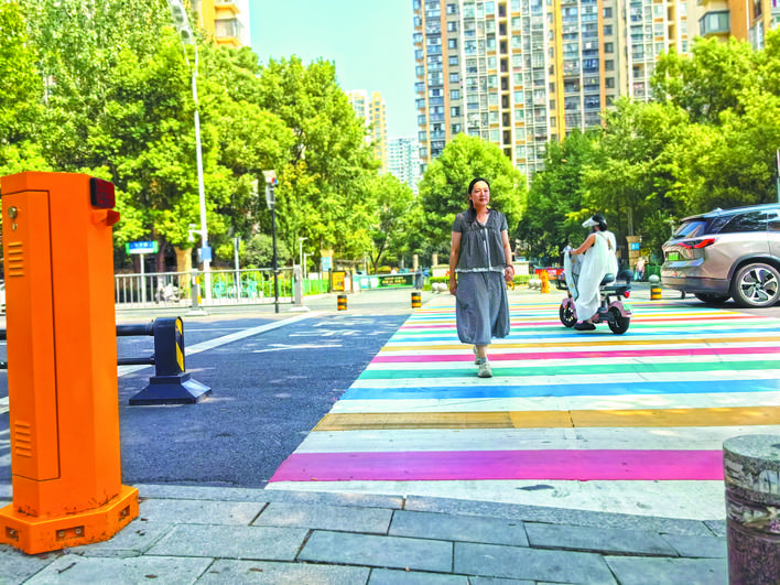 记者在滨湖和园南门路口看到,传统白色斑马线已“换新装”——红、黄、蓝、绿四色渐变的“彩虹纹”铺满路面,阳光下格外醒目。