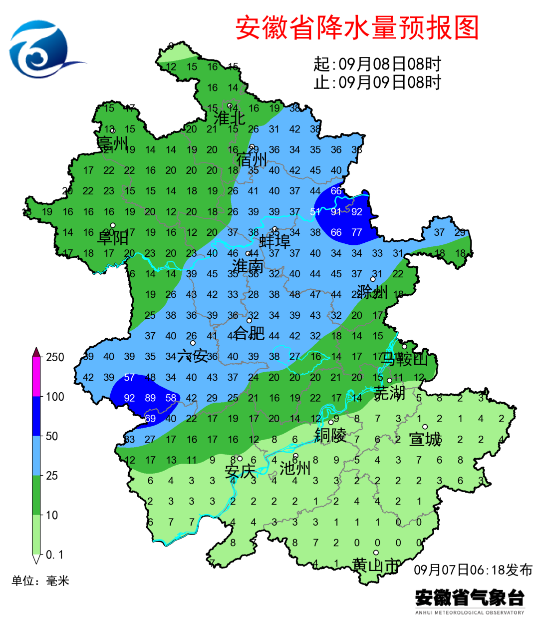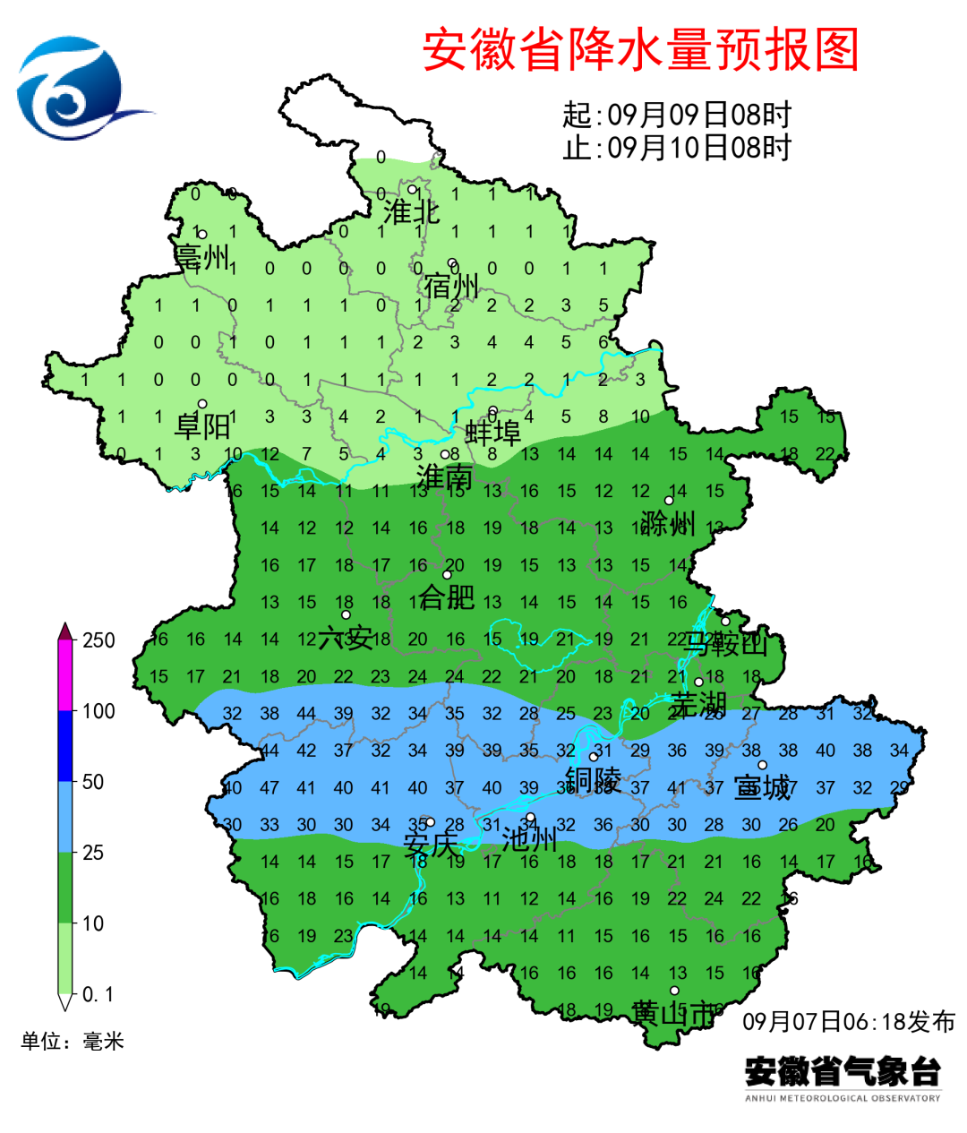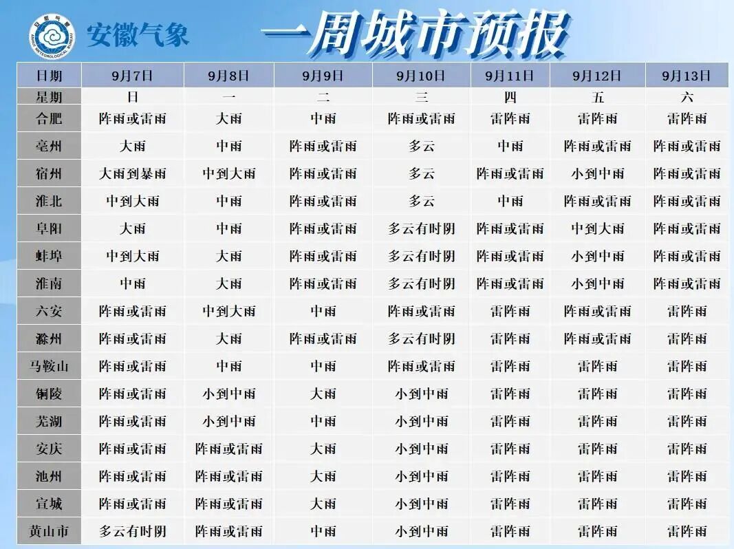 安徽省气象台2025年09月07日17时10分发布暴雨蓝色预警。