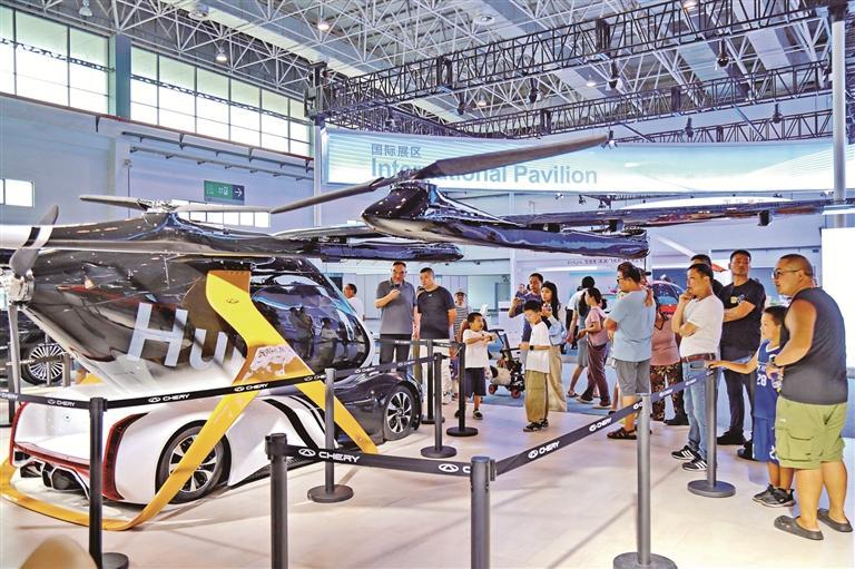 2025低空经济发展大会9月5日开幕,大会集中展示了低空经济前沿成果、标志性产品及应用场景。图为人们围观奇瑞飞行汽车。