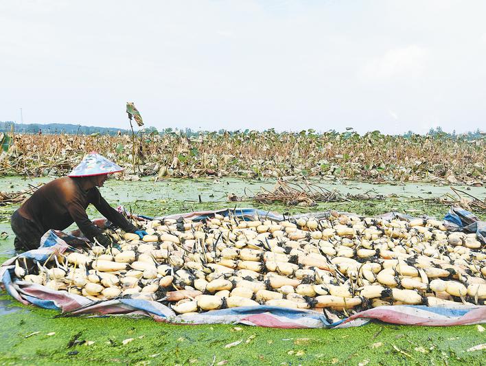 9月14日,藕农在藕田里运送刚采挖的莲藕。