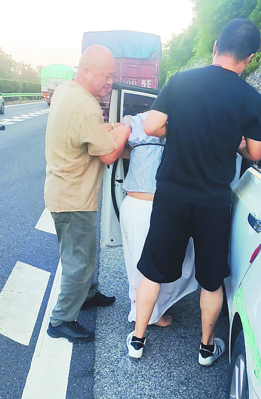 “驾驶室有人,快靠边停!救人要紧!”坐在副驾的朱传军急促喊话,正在驾车的儿子朱俊豪立刻减速,将车停在应急车道。