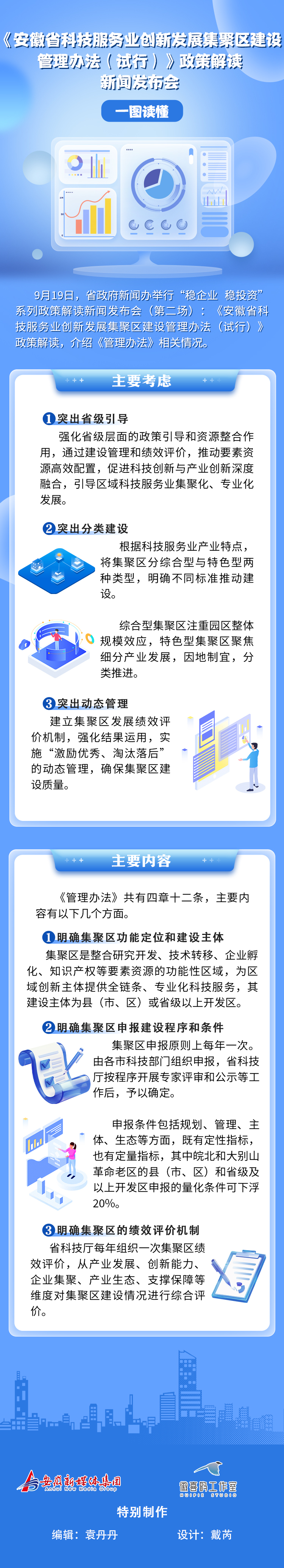 二是明确集聚区申报建设程序和条件。集聚区申报原则上每年一次。由各市科技部门组织申报,省科技厅按程序开展专家评审和公示等工作后,予以确定。申报条件包括规划、管理、主体、生态等方面,既有定性指标,也有定量指标,其中皖北和大别山革命老区的县(市、区)和省级及以上开发区申报的量化条件可下浮20%。