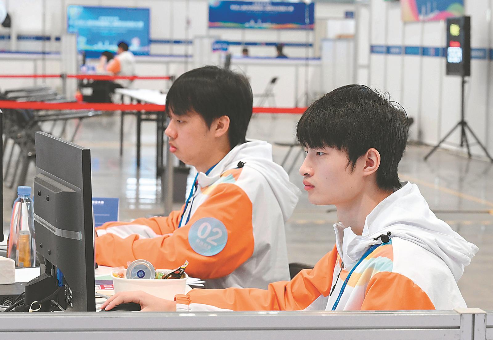 9月21日,来自阜阳技师学院的何敏(左)、宋高奇参加网络安全项目比赛,最终获得该项目铜牌。