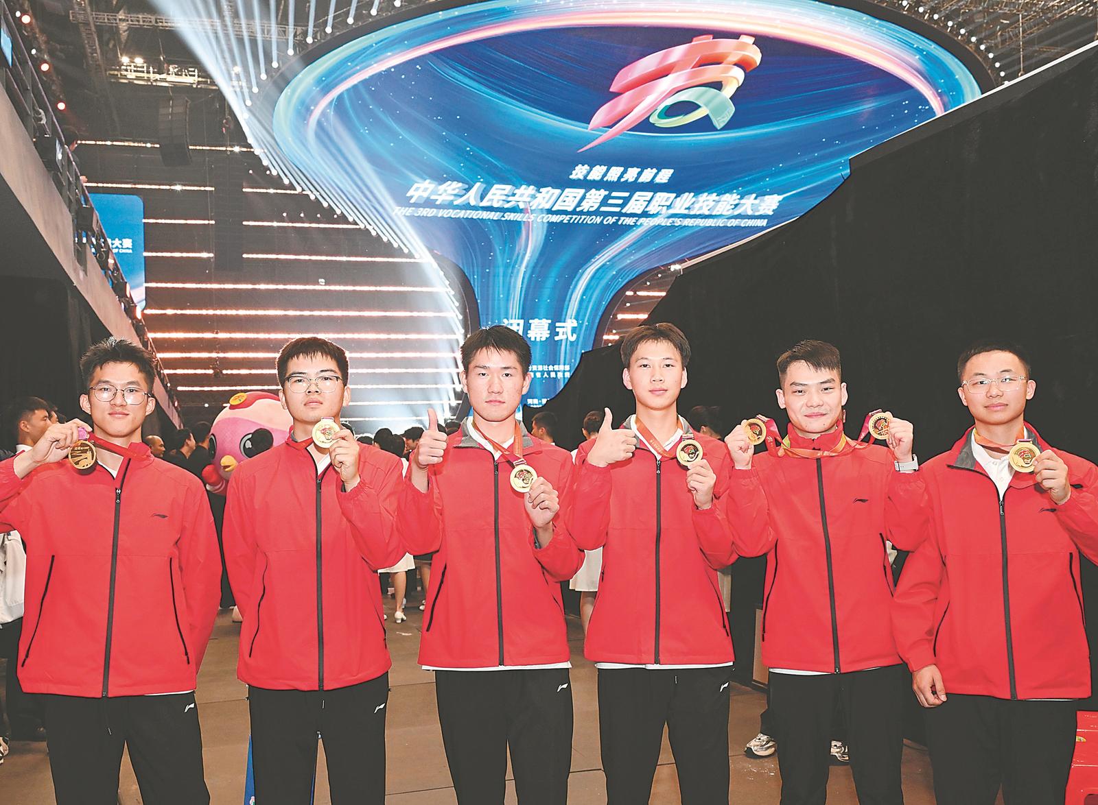 9月23日,在第三届全国技能大赛闭幕式现场,获得金牌的安徽代表团成员手持奖牌合影。