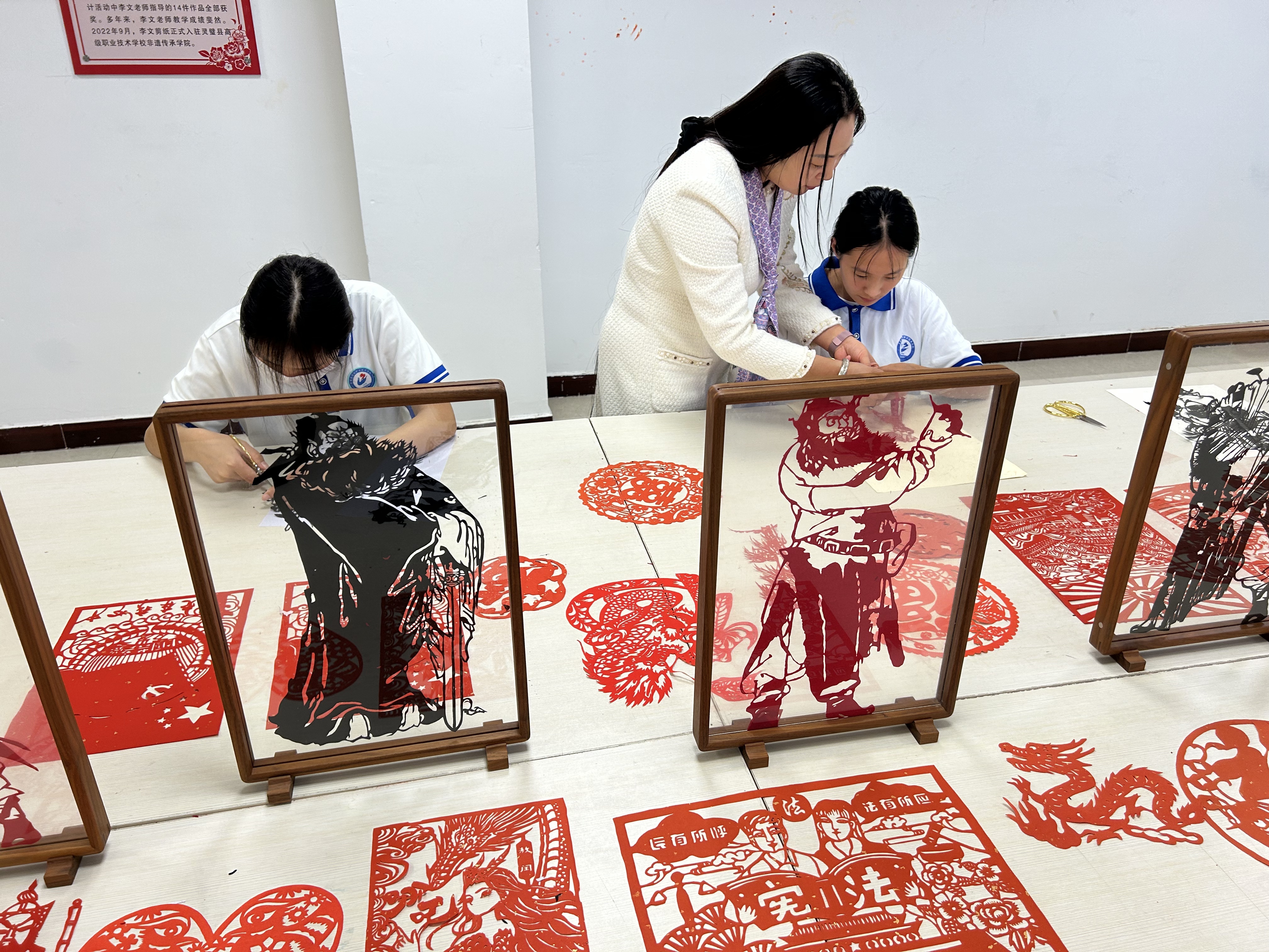 安徽灵璧县高级职业技术学校学生在老师的指导下学习钟馗剪纸