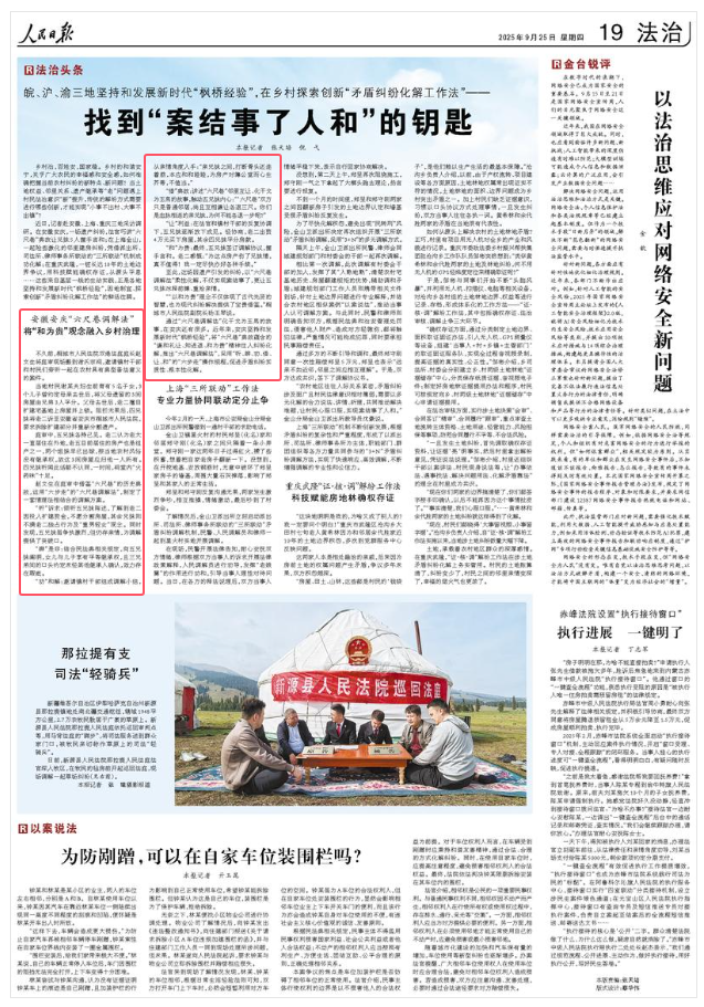 近日,记者赴安徽、上海、重庆三地采访调研。在安徽安庆,一场遗产纠纷,法官巧讲“六尺巷”典故让兄妹5人握手言和;在上海金山,一起险些激化的邻里建房纠纷,凭借派出所、司法所、律师事务所联动的“三所联动”机制成功化解;在重庆武隆,一桩长达10年的土地边界争议,用科技赋能确权存证,从源头平息……这些来自基层一线的生动实践,正是各地坚持和发展新时代“枫桥经验”,因地制宜、探索创新“矛盾纠纷化解工作法”的鲜活注脚。