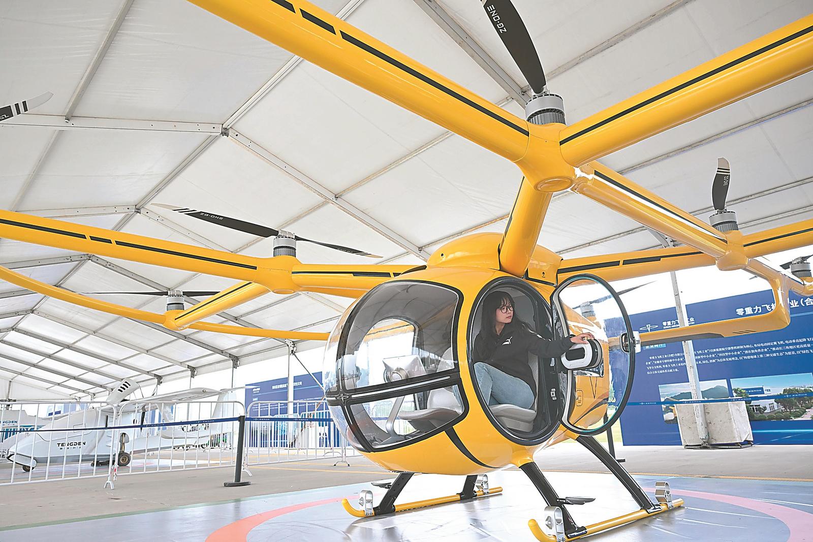 9月20日,在合肥骆岗公园全空间无人体系成果展上,观众正在体验零重力飞机工业(合肥)有限公司带来的ZG-ONE鹊飞载人飞行器。记者 张大岗 摄