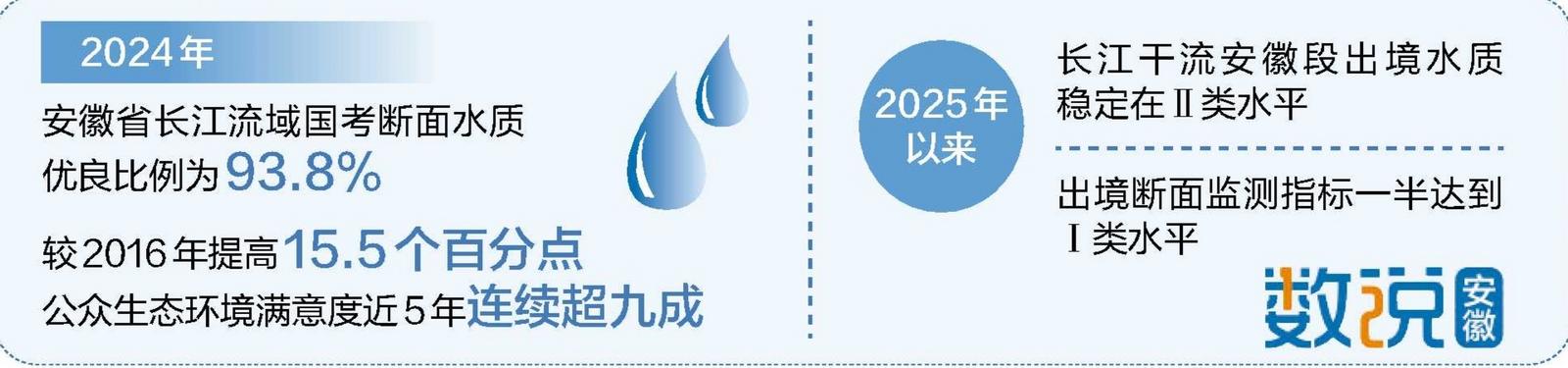 生态修复的成效正在显现。2024年,安徽省长江流域国考断面水质优良比例为93.8%,较2016年提高15.5个百分点,公众生态环境满意度近5年连续超九成。2025年以来,长江干流安徽段出境水质稳定在Ⅱ类水平,出境断面监测指标一半达到Ⅰ类水平。