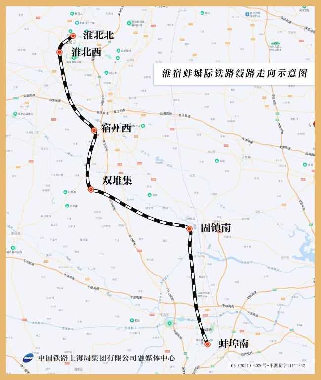 淮宿蚌城际铁路地处皖北平原,线路北起淮萧联络线淮北北站,向南途经淮北、宿州、蚌埠三市,终至京沪高铁、合蚌高铁共线车站蚌埠南站,新建正线全长约161公里,设计时速350公里。全线共设6座车站,其中淮北西站、宿州西站、双堆集站、固镇南站为新建车站,淮北北站、蚌埠南站为既有车站。