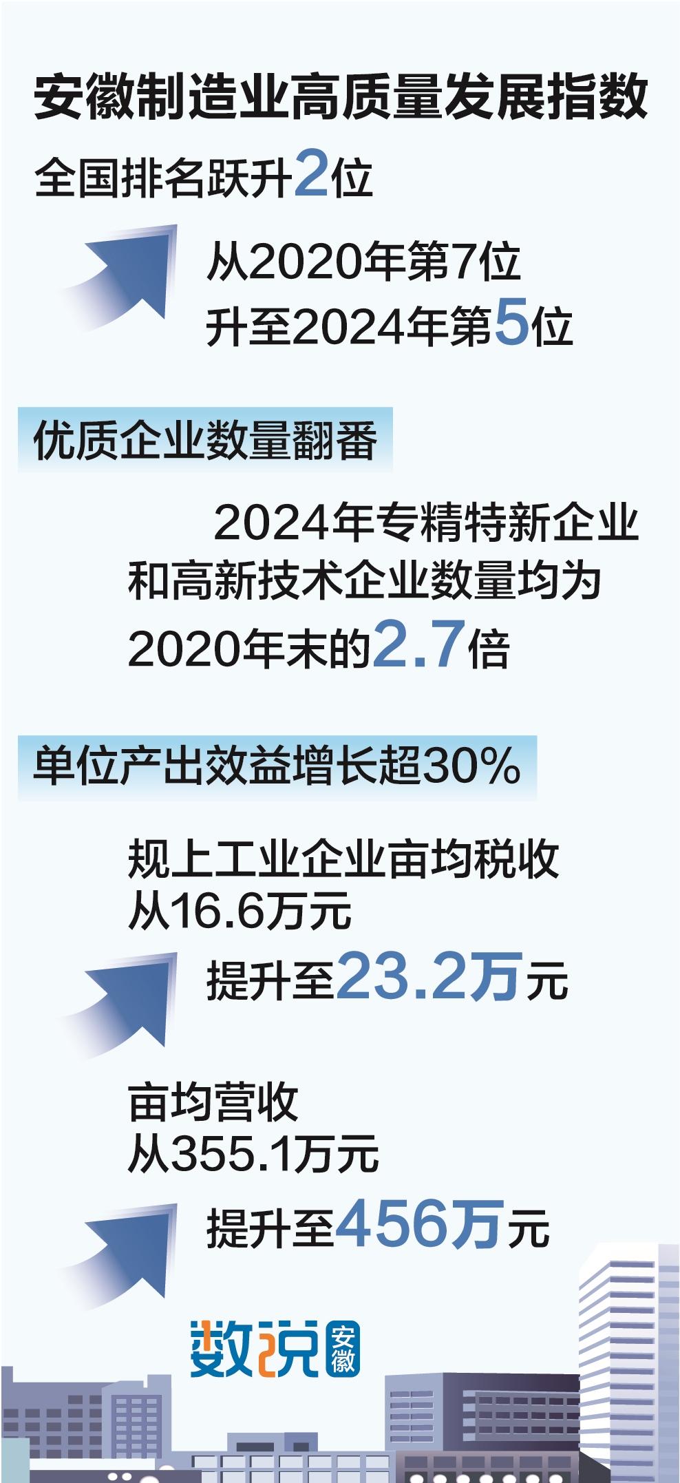 从实验室突破到车间量产,从传统制造到数字智造,从单点企业到集群共进,安徽始终以创新驱动为底色,不断为产业发展“强筋壮骨”。五年间,安徽制造业高质量发展指数全国排名跃升2位,从2020年第7位升至2024年第5位;优质企业数量翻番,2024年专精特新企业和高新技术企业数量均为2020年末的2.7倍;单位产出效益增长超30%,规上工业企业亩均税收从16.6万元提升至23.2万元,亩均营收从355.1万元提升至456万元。(记者 丰静)