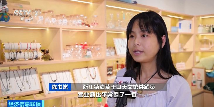 浙江德清莫干山天文馆讲解员 陈书岚:国庆假期期间,我们天文馆的游览人数比平常增加了50%,营业额比平常翻了一番。莫干山一些地图的文创,包括一些陨石的饰品,还有橄榄陨石等各式各样的首饰会卖得比较好。