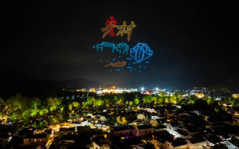宏村景区延续昨日的科技魅力,无人机表演再次点亮南湖夜空。数百架无人机以天为幕,变幻出烟花绽放、画桥、牌坊等动人画面,将现代光影艺术完美融入水墨徽州,为游客呈现一场视觉与想象交织的盛宴。此外,“国庆中医夜市”在黟县古城热闹开市,将中医药文化与市井烟火巧妙融合。游客可品尝药膳茶饮、体验推拿艾灸,在轻松氛围中感受“治未病”的传统智慧;秀里鱼灯巡游、西递近景徽剧等系列活动也持续开展。