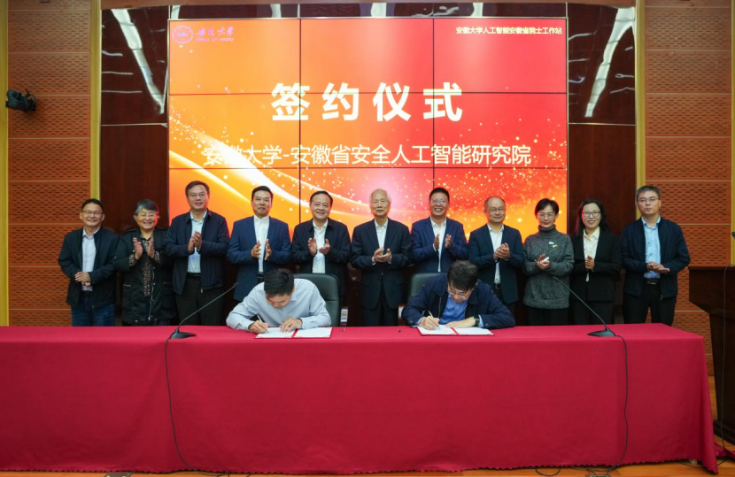 安徽大学科学技术处处长郑春厚与安徽省安全人工智能研究院院长朱金良共同签署合作协议。