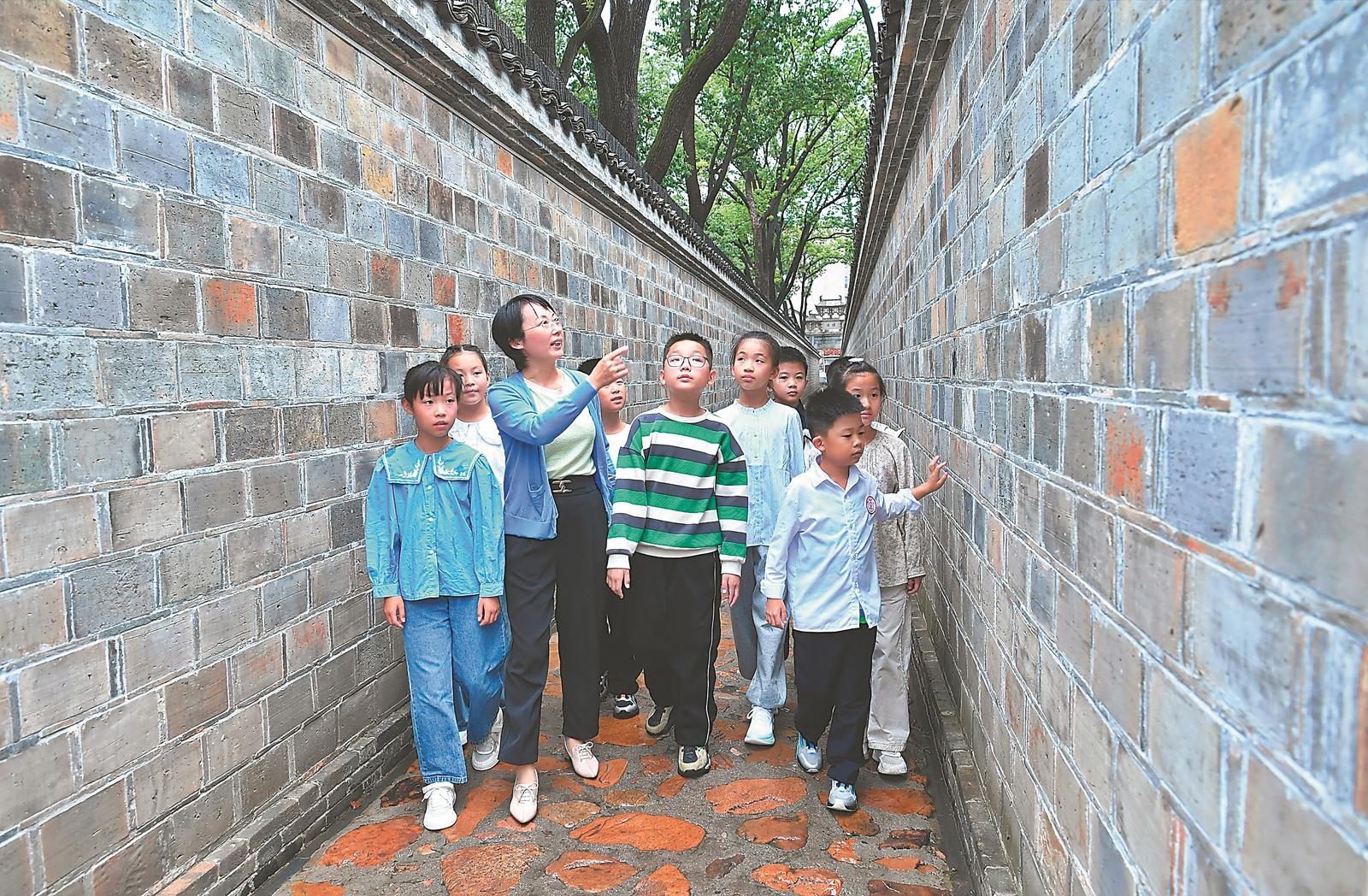 桐城市北街小学学生在老师带领下,在六尺巷学习典故。(资料图片) 记者 程兆 摄