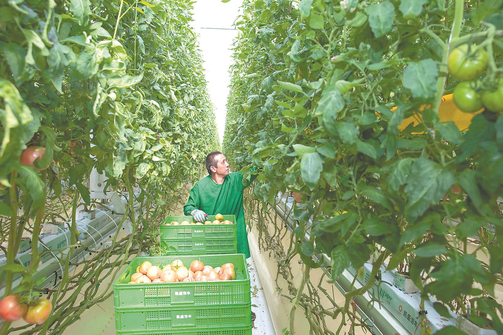 凤阳县小岗村,凯盛浩丰数字智慧农业温室内,工人在采摘番茄。(资料图片) 通讯员 卢志永 摄