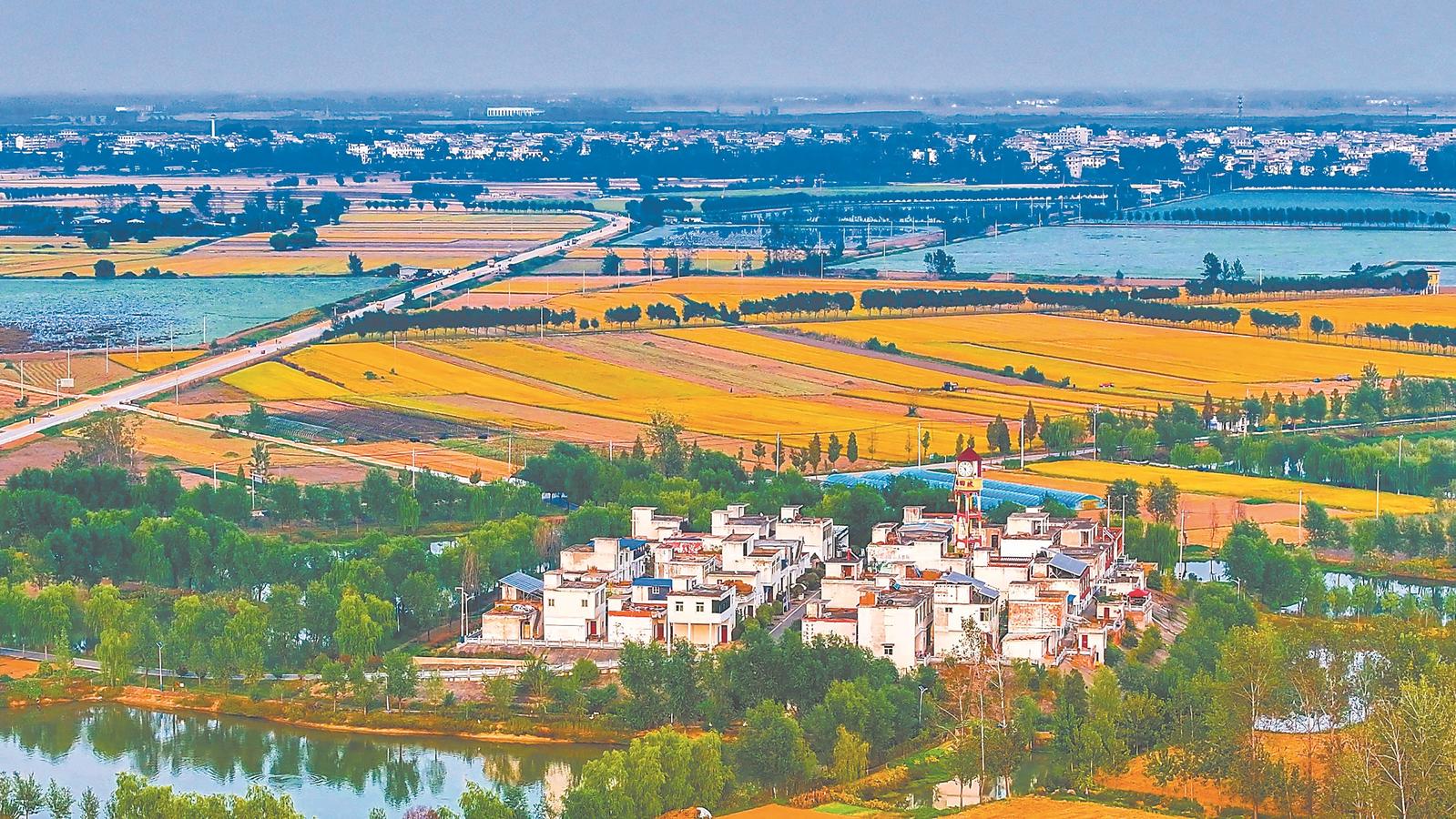 10月14日,在阜南县蒙洼蓄洪区,大片水稻进入成熟期,田间地头一片金黄,与庄台道路构成美丽的丰收画卷。通讯员 庞诚 摄