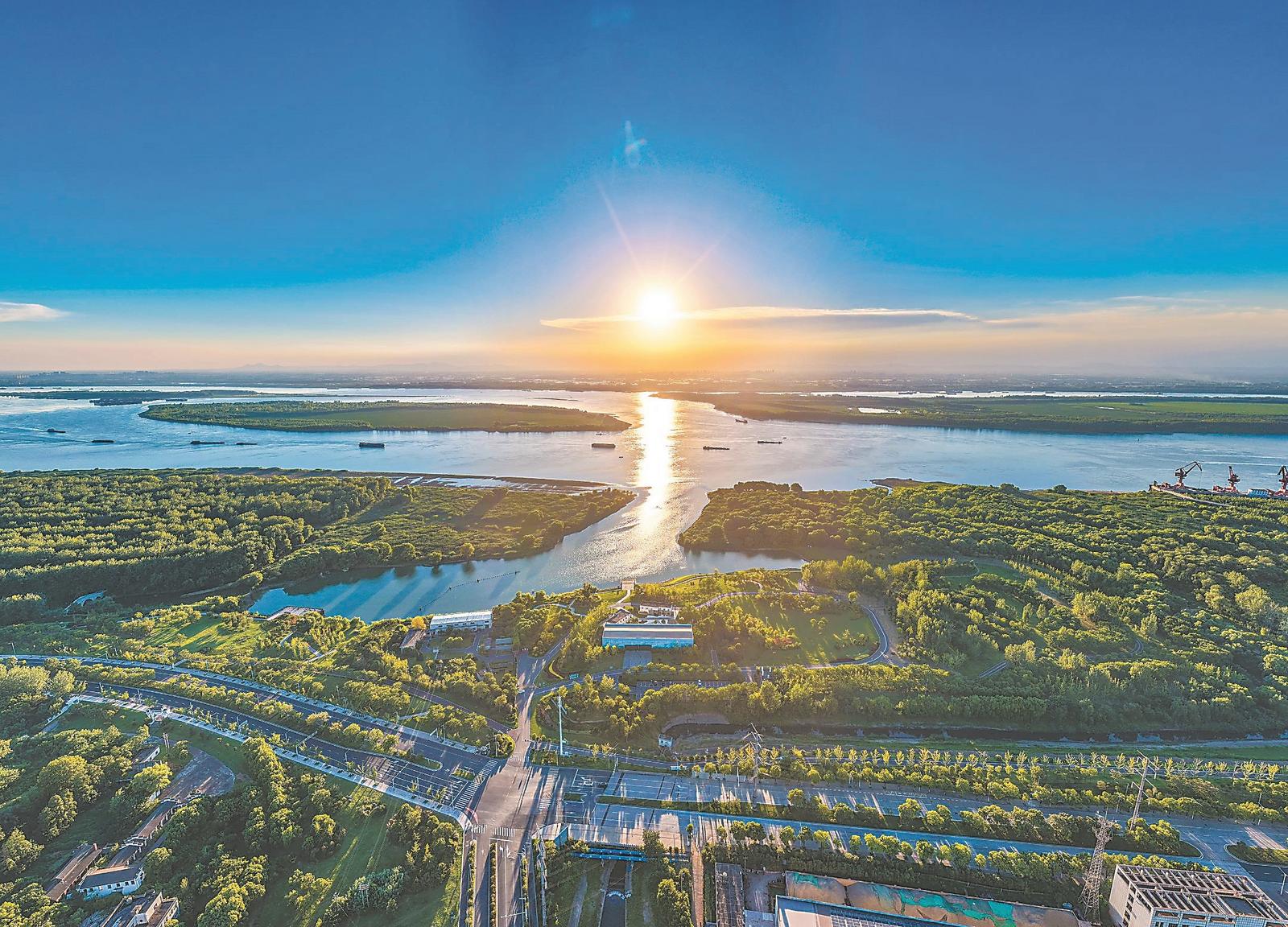 位于长江之滨的马鞍山市薛家洼生态园,在夕阳的映照下,勾勒出一幅“江天一色”的生态长卷。(资料图片)特约摄影 王文生 通讯员 刘斌 摄