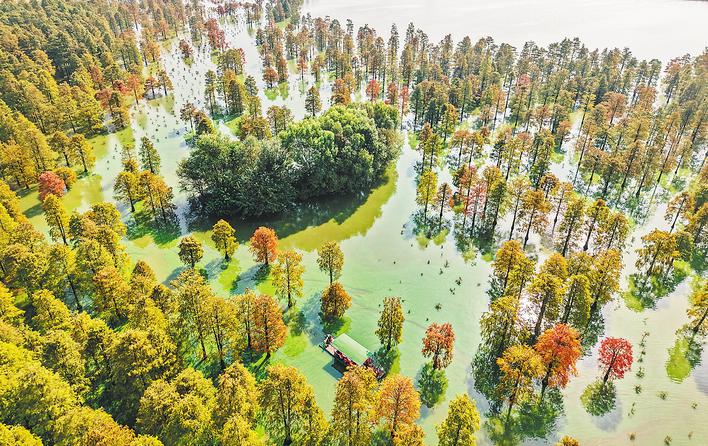 11月2日,庐江县柯坦镇城池村大汉塘近万株池杉褪去“绿装”,换上浓烈的“红妆”,与碧水蓝天交相辉映,宛如一幅浑然天成的画卷,吸引众多市民和摄影爱好者前来“打卡”。通讯员 李红兵 摄