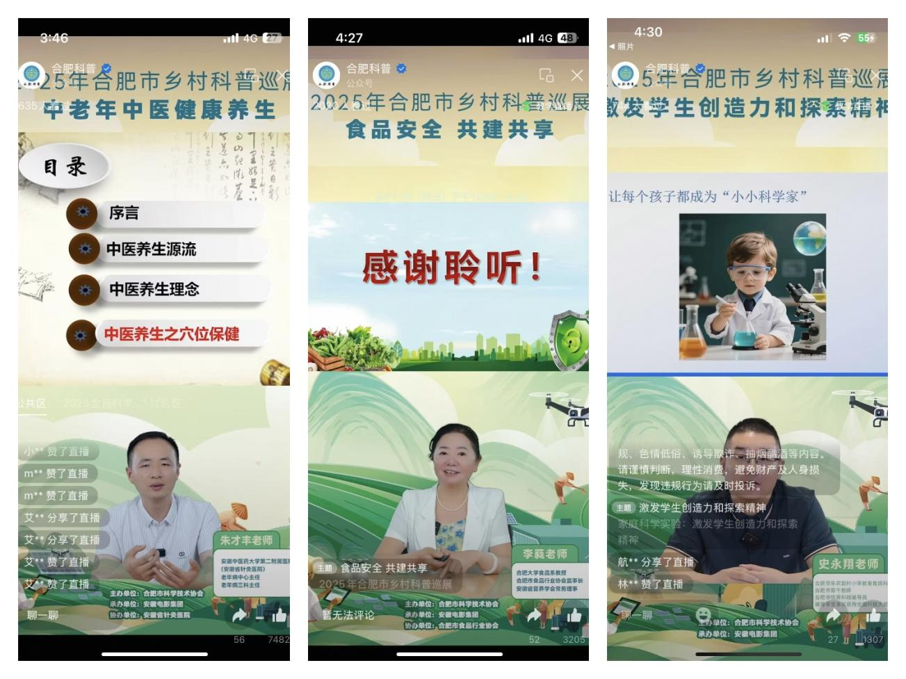 为打破地域限制、破解线下活动覆盖范围有限的难题,本次巡展创新打造“线上直播+线下巡展”双线并行的科普模式,其中三场线上直播专场成为科普服务的重要延伸与补充,让优质科普资源触达更广泛的人群。直播专场聚焦群众高度关注的热点主题,精心筛选主讲嘉宾,通过“理论讲解+经典案例”的形式,深入解读专业知识、回应网友关切。直播依托“合肥科普”微信公众号搭建便捷观看平台,支持提前预约、实时留言互动与回放重温,有效满足了上班族、偏远乡村群众、行动不便的老年人等线下活动难以覆盖群体的科普需求,构建起“随时随地学科学”的便捷渠道,让科普服务真正突破时空边界。