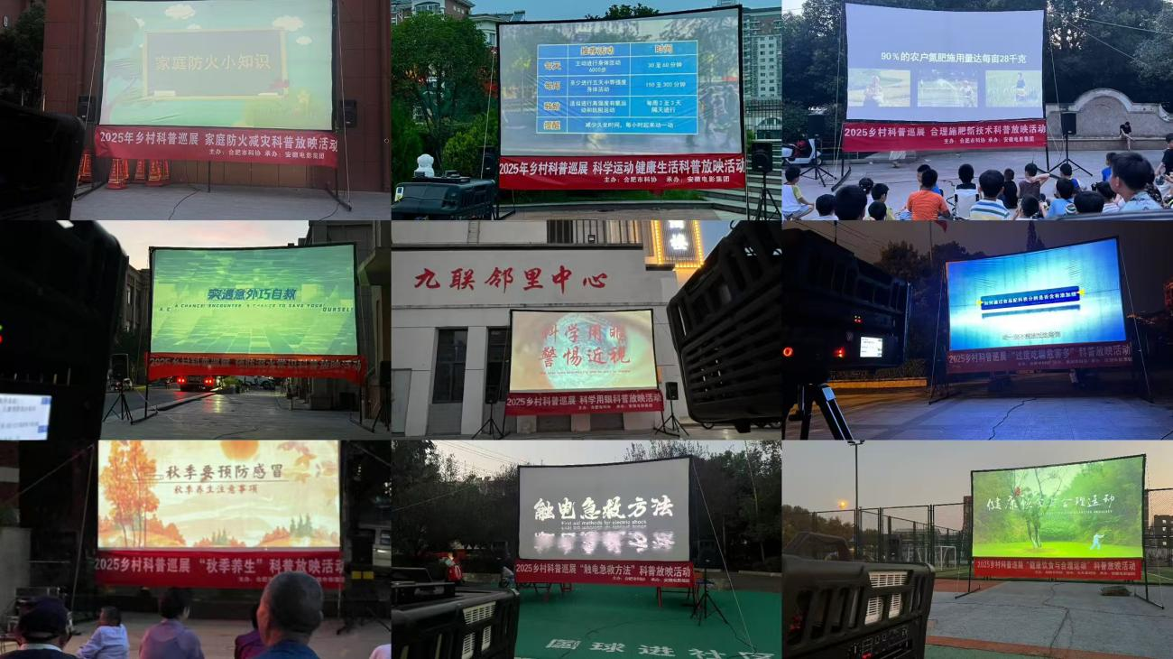 乡村科普巡展采用创新性“公益电影+科普宣传”模式,将专业知识融入光影艺术,通过线下讲座、影片放映、展板展示与线上直播相结合的形式,让科普教育既接地气又有温度。合肥市科学技术协会作为主办单位,始终立足乡村振兴战略全局,为巡展提供了坚实的政策支持和组织保障;安徽电影集团从内容设计上兼顾专业性与通俗性,呈现融合光影艺术与互动体验,成为巡展高效落地的核心引擎;众多协办单位,结合自身领域特色与资源禀赋,实现“哪里有需求,科普就到哪里”。
