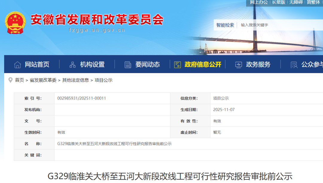 现将G329临淮关大桥至五河大新段改线工程可行性研究报告审批内容予以公示。公示时间自公示之日起10个工作日(11月7日—11月20日),如有意见和建议,请以来人或署名来信(包括电子信函)方式向省发展改革委基础设施发展处反映,并提供姓名及联系电话,对匿名方式提出异议的不予受理。
