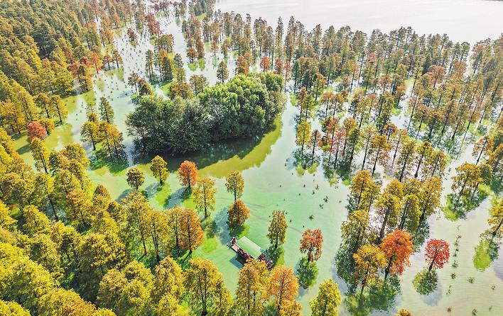 眼下,正是其色彩最丰富的“渐变期”。从空中俯瞰,万株池杉像一柄柄色彩各异的“雨伞尖”,错落有致地扎根在水面。若是选择坐在游船上缓缓前行,穿梭其间,宛如行在画里。微风拂过,枝叶轻摇,光影荡漾,一派“树在水中生,影在画中动”的幽静意境。
