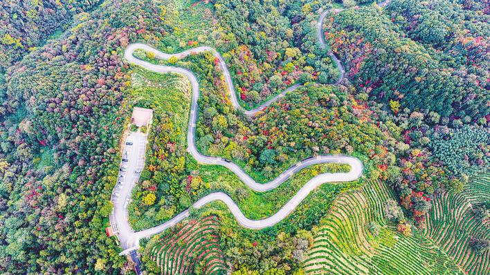 11月10日,庐江县汤池镇果树村至二姑尖景区,蜿蜒的公路在初冬五彩斑斓的山岭中若隐若现,蔚为壮观。近年来,庐江县以建设“四好农村路”为主线,改扩建4000多公里的乡村公路,串起全县30个乡村旅游重点村,打造“一村一景”“一村一品”“一村一韵”,让乡村公路成为农民的致富路、幸福路。 通讯员 巢志斌 摄