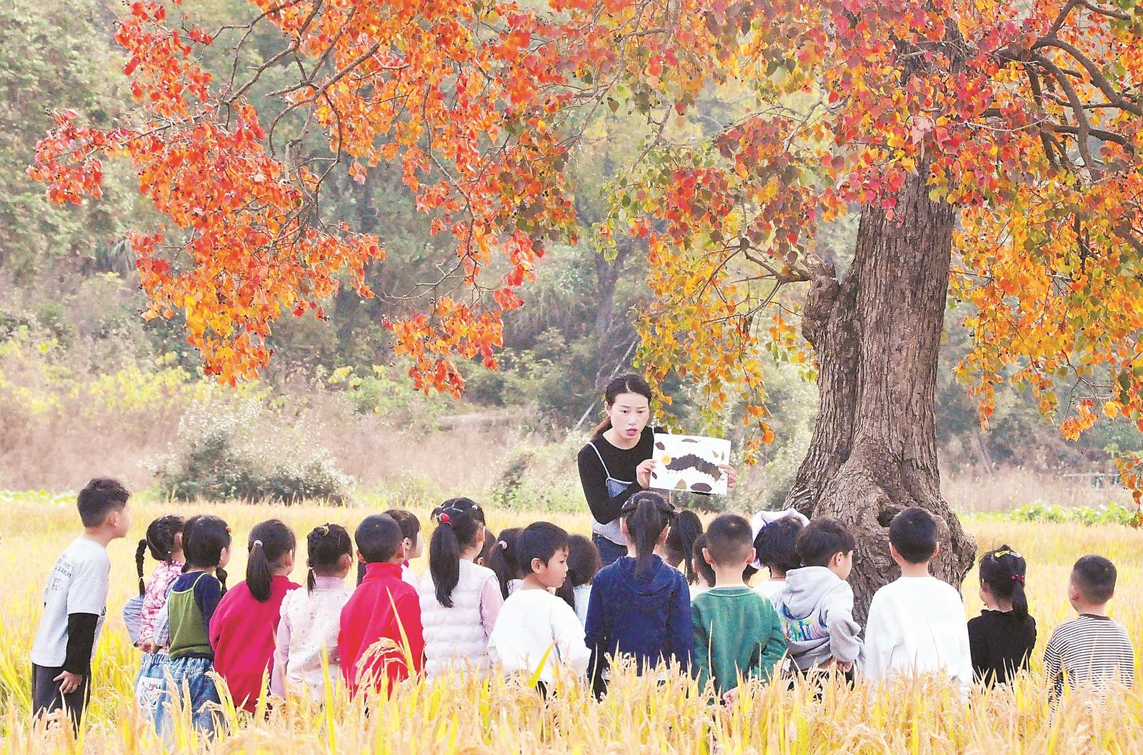 11月11日,黟县宏村景区附近的稻田里,一群萌娃跟随老师识别稻谷、捡拾红叶、绘制自然美景,体验大自然之妙趣。通讯员 朱光明 摄